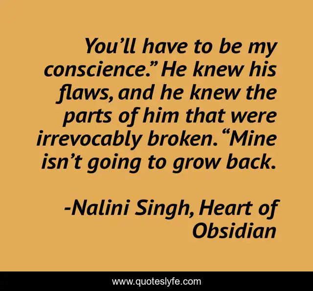 This page presents the quote "You’ll have to be my conscience.” He knew his flaws, and he knew the parts of him that were irrevocably broken. “Mine isn’t going to grow back.". Author of this quote is Nalini Singh, Heart of Obsidian. This quote is about conscience, kaleb, sahara,.