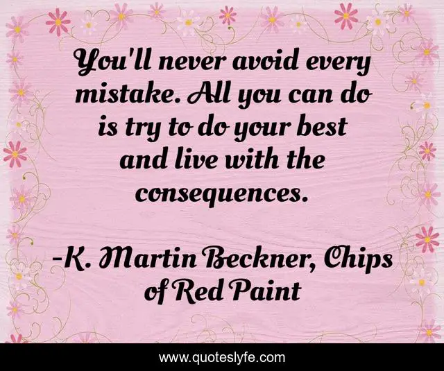 This page presents the quote "You'll never avoid every mistake. All you can do is try to do your best and live with the consequences.". Author of this quote is K. Martin Beckner, Chips of Red Paint. This quote is about mistakes, consequences,.