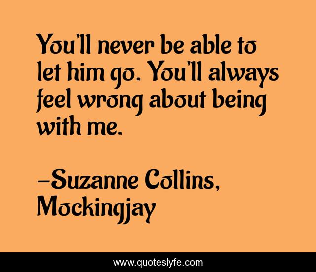 This page presents the quote "You'll never be able to let him go. You'll always feel wrong about being with me.". Author of this quote is Suzanne Collins, Mockingjay. This quote is about love, lost, letting-go, gale, katniss, mockingjay, affection,.