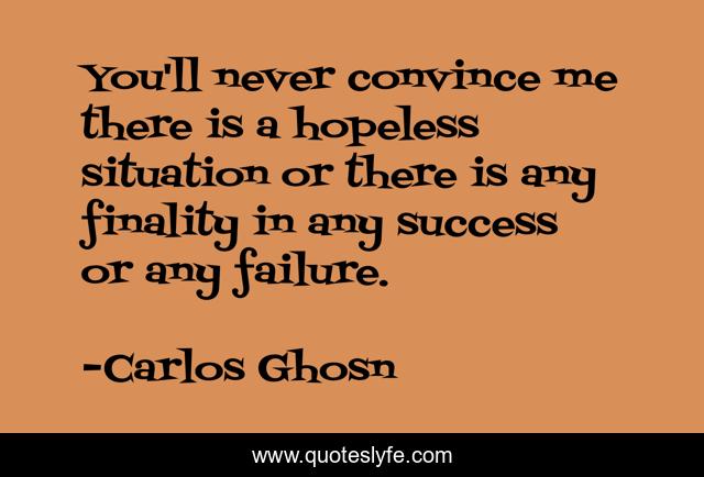 This page presents the quote "You'll never convince me there is a hopeless situation or there is any finality in any success or any failure.". Author of this quote is Carlos Ghosn. This quote is about me, success,.