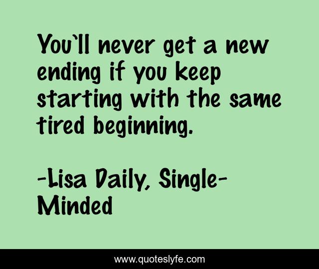 This page presents the quote "You’ll never get a new ending if you keep starting with the same tired beginning.". Author of this quote is Lisa Daily, Single-Minded. This quote is about dating, love, singles, new-beginnings, starting-over, single-minded, beginning, beginnings-and-endings, affection,.