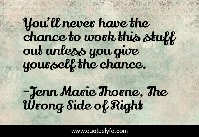 This page presents the quote "You’ll never have the chance to work this stuff out unless you give yourself the chance.". Author of this quote is Jenn Marie Thorne, The Wrong Side of Right. This quote is about chance, the-wrong-side-of-right,.