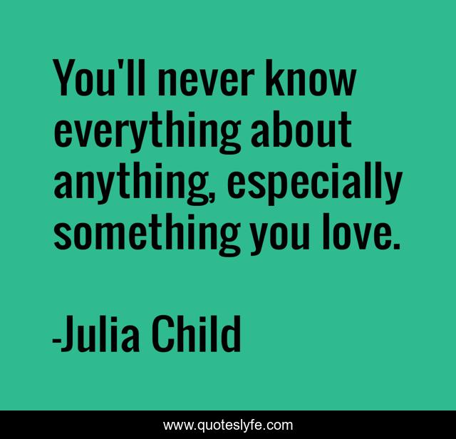 This page presents the quote "You'll never know everything about anything, especially something you love.". Author of this quote is Julia Child. This quote is about lifelong-learning, education, love, affection,.