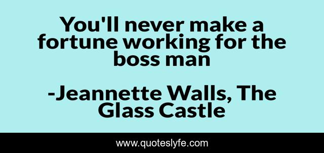 This page presents the quote "You'll never make a fortune working for the boss man". Author of this quote is Jeannette Walls, The Glass Castle. This quote is about business-advice, wealth, advice, career-ladder, boss, fortune,.