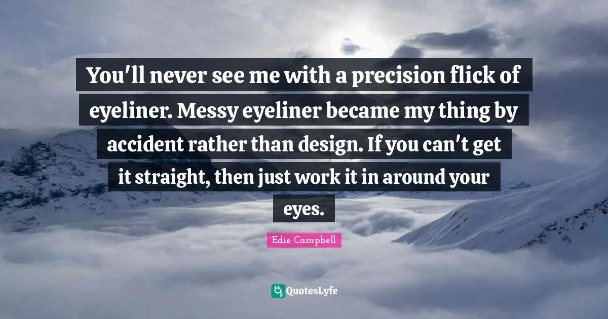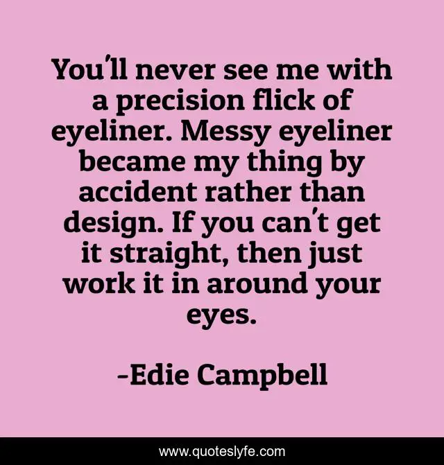 This page presents the quote "You'll never see me with a precision flick of eyeliner. Messy eyeliner became my thing by accident rather than design. If you can't get it straight, then just work it in around your eyes.". Author of this quote is Edie Campbell. This quote is about me, eyes, work,.