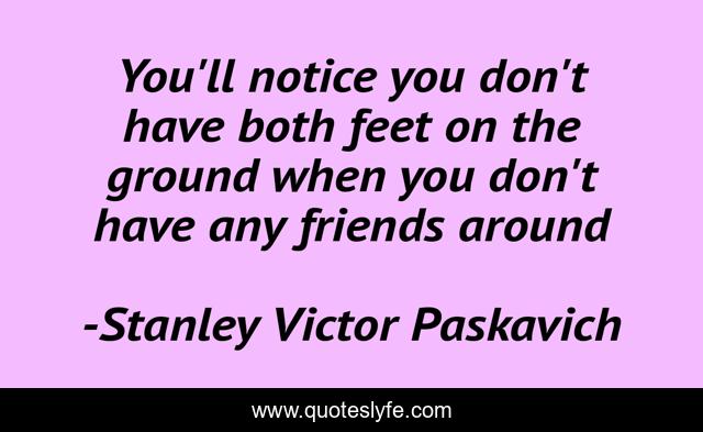 This page presents the quote "You'll notice you don't have both feet on the ground when you don't have any friends around". Author of this quote is Stanley Victor Paskavich. This quote is about faults, life, friendship, conceited, reality,.