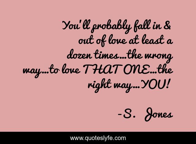 This page presents the quote "You’ll probably fall in & out of love at least a dozen times…the wrong way…to love THAT ONE…the right way…YOU!". Author of this quote is S. Jones. This quote is about adoration, adornment, love, quote, self-love, quotes-by-s-jones, quotes, falling-in-love, affection,.