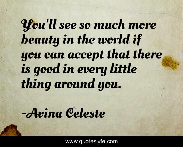 This page presents the quote "You'll see so much more beauty in the world if you can accept that there is good in every little thing around you.". Author of this quote is Avina Celeste. This quote is about confidence, good, beauty, positive, motivational, optimistic, inspirational, enthusiasm,.