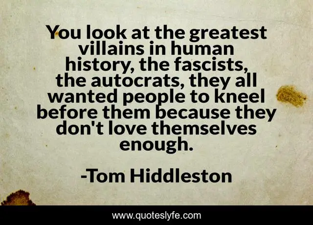This page presents the quote "You look at the greatest villains in human history, the fascists, the autocrats, they all wanted people to kneel before them because they don't love themselves enough.". Author of this quote is Tom Hiddleston. This quote is about love, greatest, affection, people,.