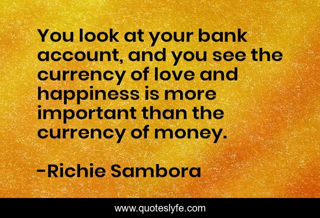 This page presents the quote "You look at your bank account, and you see the currency of love and happiness is more important than the currency of money.". Author of this quote is Richie Sambora. This quote is about money, love, affection,.