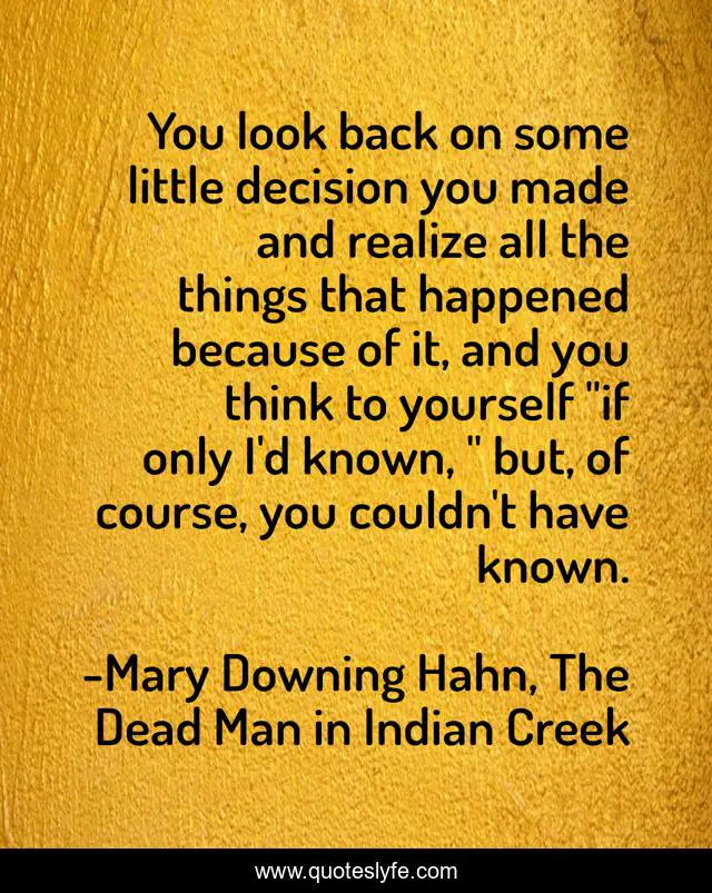 This page presents the quote "You look back on some little decision you made and realize all the things that happened because of it, and you think to yourself "if only I'd known, " but, of course, you couldn't have known.". Author of this quote is Mary Downing Hahn, The Dead Man in Indian Creek. This quote is about mystery, adventure,.