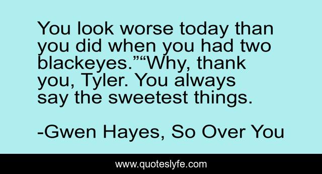 This page presents the quote "You look worse today than you did when you had two blackeyes.”“Why, thank you, Tyler. You always say the sweetest things.". Author of this quote is Gwen Hayes, So Over You. This quote is about funny, comedy,.