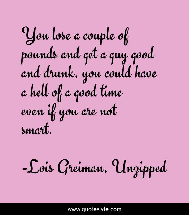 This page presents the quote "You lose a couple of pounds and get a guy good and drunk, you could have a hell of a good time even if you are not smart.". Author of this quote is Lois Greiman, Unzipped. This quote is about mystery, chick, lit-humor,.