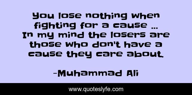 This page presents the quote "You lose nothing when fighting for a cause ... In my mind the losers are those who don't have a cause they care about.". Author of this quote is Muhammad Ali. This quote is about enthusiasm, inspirational,.