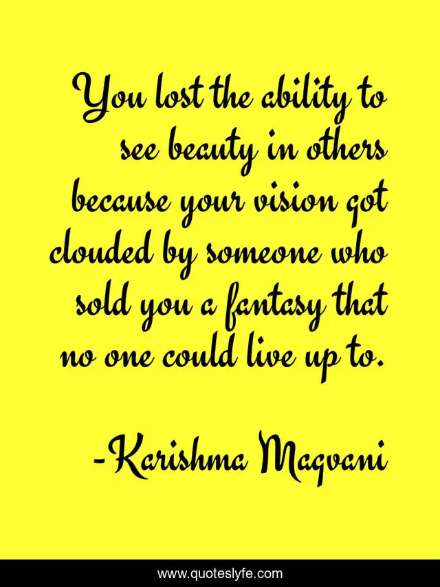 This page presents the quote "You lost the ability to see beauty in others because your vision got clouded by someone who sold you a fantasy that no one could live up to.". Author of this quote is Karishma Magvani. This quote is about life, love, ability, beauty, beautiful-forevers, forever-ends, past, fantasy, let-go,.