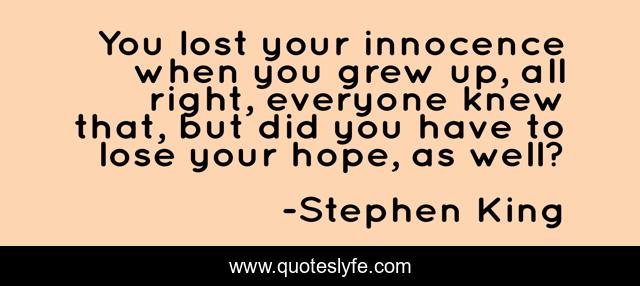 This page presents the quote "You lost your innocence when you grew up, all right, everyone knew that, but did you have to lose your hope, as well?". Author of this quote is Stephen King. This quote is about loss, growing-up, hope, innocence,.