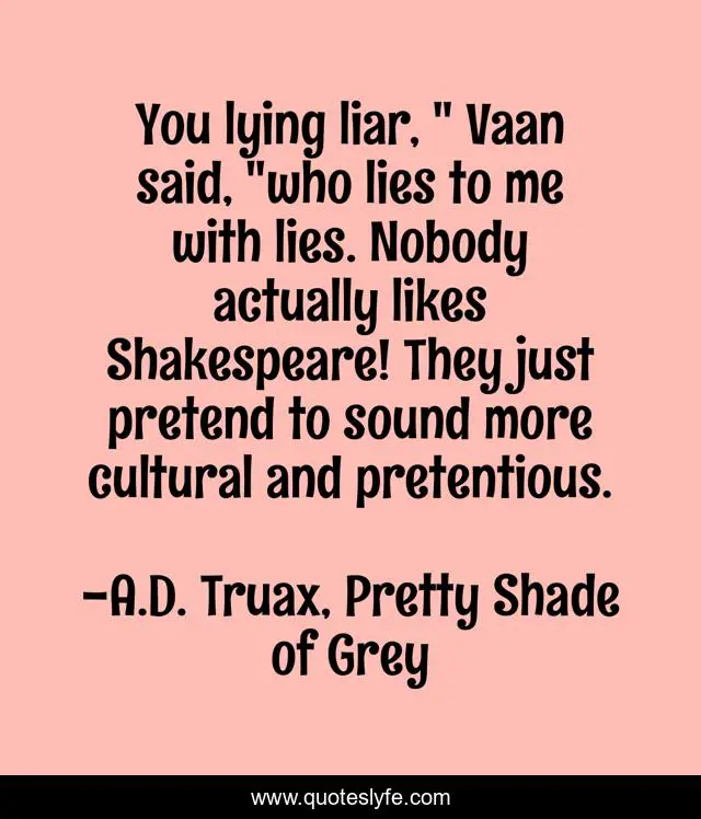 This page presents the quote "You lying liar, " Vaan said, "who lies to me with lies. Nobody actually likes Shakespeare! They just pretend to sound more cultural and pretentious.". Author of this quote is A.D. Truax, Pretty Shade of Grey. .