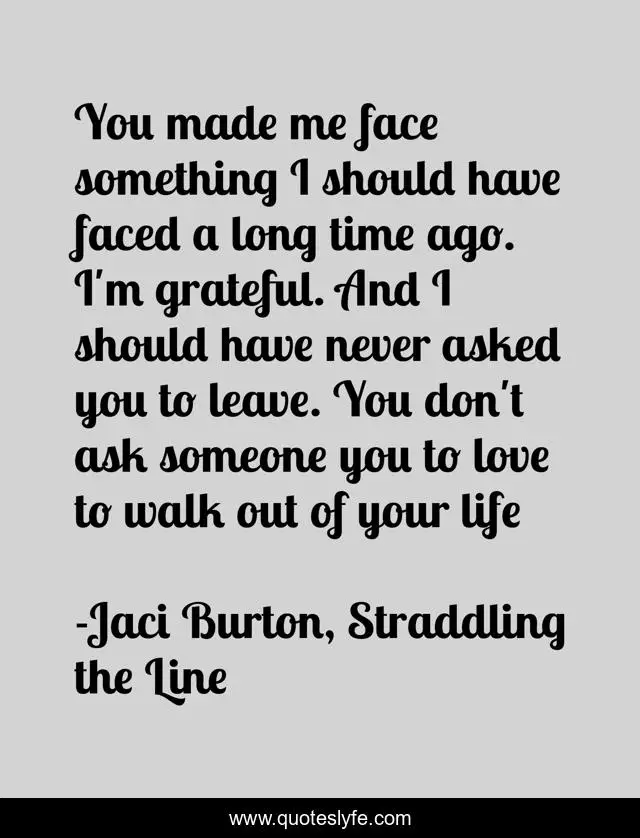 This page presents the quote "You made me face something I should have faced a long time ago. I'm grateful. And I should have never asked you to leave. You don't ask someone you to love to walk out of your life". Author of this quote is Jaci Burton, Straddling the Line. This quote is about beautiful, and-sweet, romantic,.