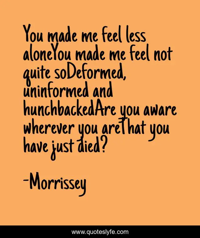 "Morrissey Quotes." Quoteslyfe.com, 2025. Sat. 06 Dec. 2025. <https://www.quoteslyfe.com/quote/You-made-me-feel-less-aloneYou-made-248185>.