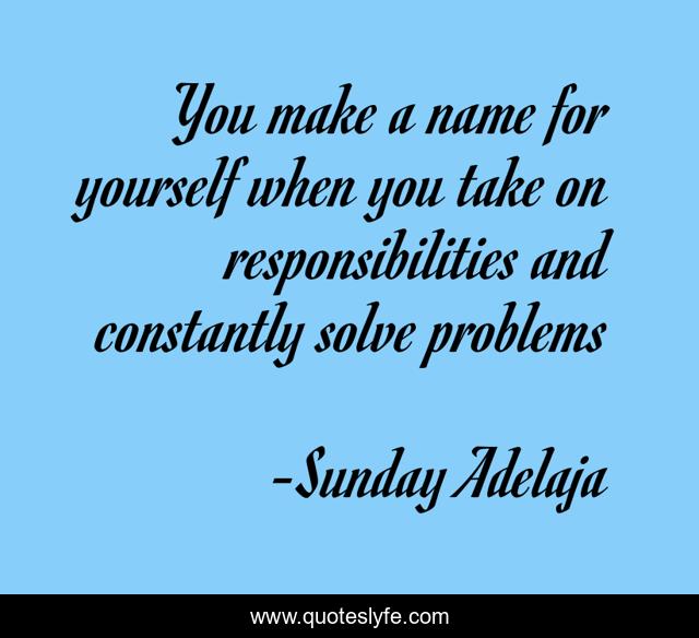 This page presents the quote "You make a name for yourself when you take on responsibilities and constantly solve problems". Author of this quote is Sunday Adelaja. This quote is about life, people, problems, calling, famous, responsibility, purpose, truth, history,.