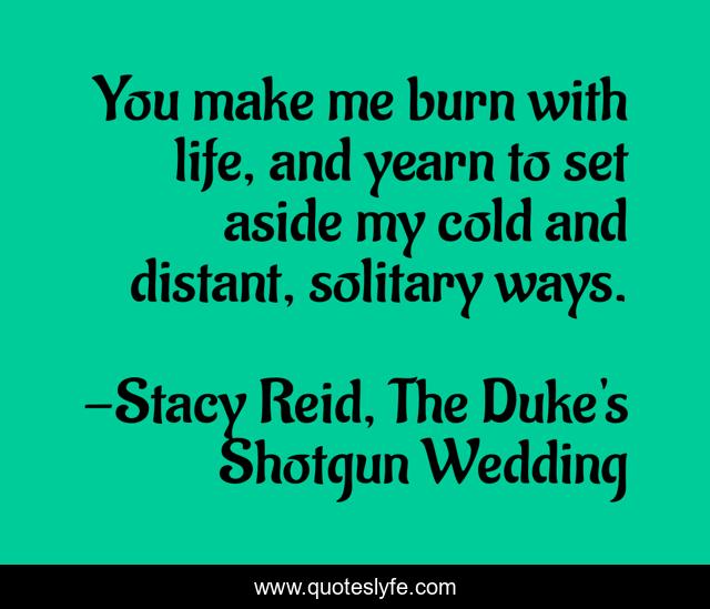 This page presents the quote "You make me burn with life, and yearn to set aside my cold and distant, solitary ways.". Author of this quote is Stacy Reid, The Duke's Shotgun Wedding. This quote is about romance, stacy-reid, historical-romance, victorian-era,.