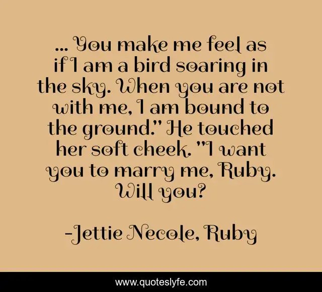 This page presents the quote "... You make me feel as if I am a bird soaring in the sky. When you are not with me, I am bound to the ground." He touched her soft cheek. "I want you to marry me, Ruby. Will you?". Author of this quote is Jettie Necole, Ruby. This quote is about new-adult-paranormal-romance, regency-era, warlocks, vampires,.