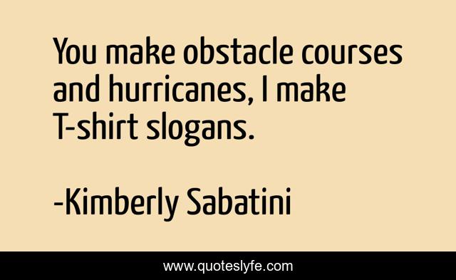 This page presents the quote "You make obstacle courses and hurricanes, I make T-shirt slogans.". Author of this quote is Kimberly Sabatini. .
