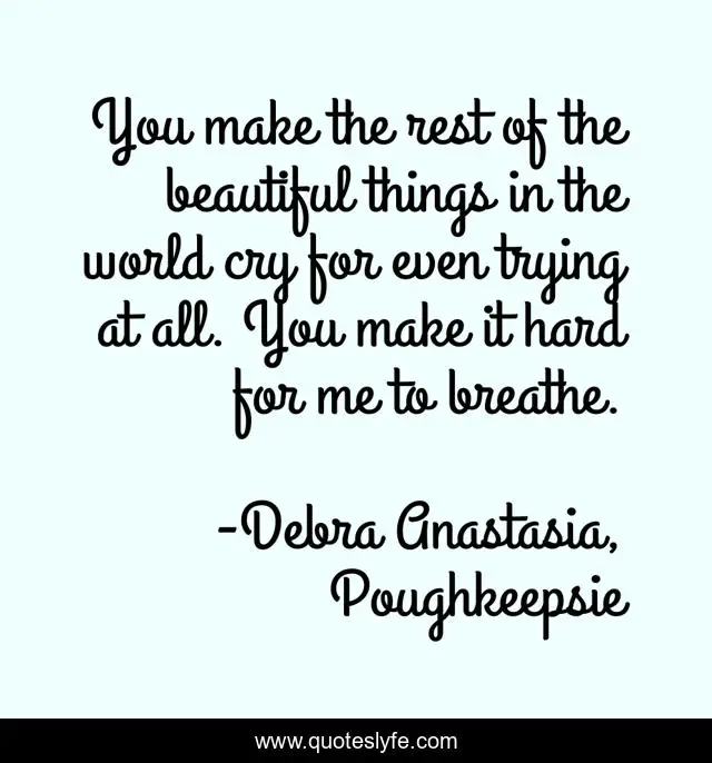 This page presents the quote "You make the rest of the beautiful things in the world cry for even trying at all. You make it hard for me to breathe.". Author of this quote is Debra Anastasia, Poughkeepsie. This quote is about romance, livia-and-blake, love, hope, affection,.