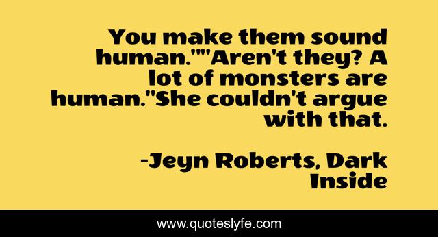 This page presents the quote "You make them sound human.""Aren't they? A lot of monsters are human."She couldn't argue with that.". Author of this quote is Jeyn Roberts, Dark Inside. This quote is about humanity, monsters,.