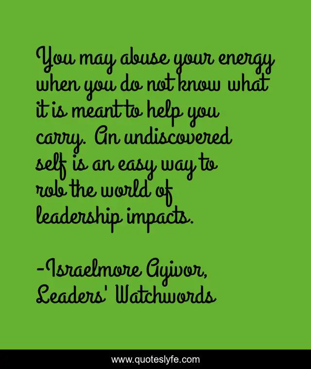 This page presents the quote "You may abuse your energy when you do not know what it is meant to help you carry. An undiscovered self is an easy way to rob the world of leadership impacts.". Author of this quote is Israelmore Ayivor, Leaders' Watchwords. This quote is about leaders, impacts, energy, discover-your-purpose, carry, die-empty, impact, food-for-thought, self,.