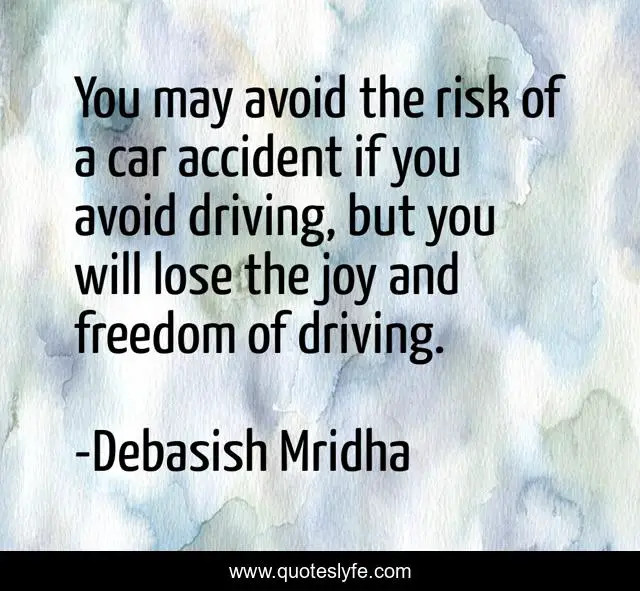 This page presents the quote "You may avoid the risk of a car accident if you avoid driving, but you will lose the joy and freedom of driving.". Author of this quote is Debasish Mridha. This quote is about risk-of-driving, philosophy, debasish-mridha, quotes, debasish-mridha-md, inspirational, how-to-avoid-a-car-accident, enthusiasm, freedom-of-driving,.