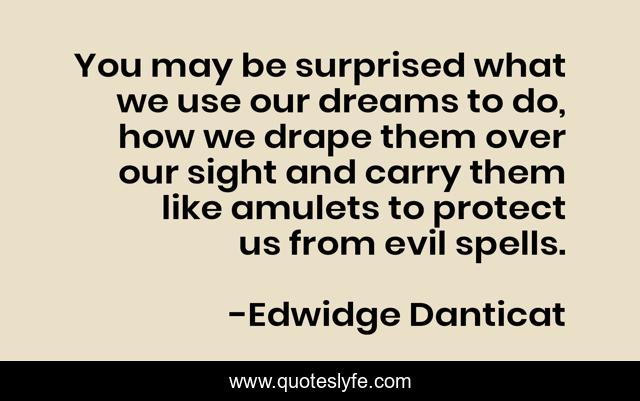 This page presents the quote "You may be surprised what we use our dreams to do, how we drape them over our sight and carry them like amulets to protect us from evil spells.". Author of this quote is Edwidge Danticat. .