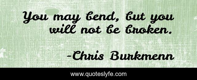 This page presents the quote "You may bend, but you will not be broken.". Author of this quote is Chris Burkmenn. This quote is about faith, life, inspire, power, god, motivational, motivation, jesus, optimistic,.