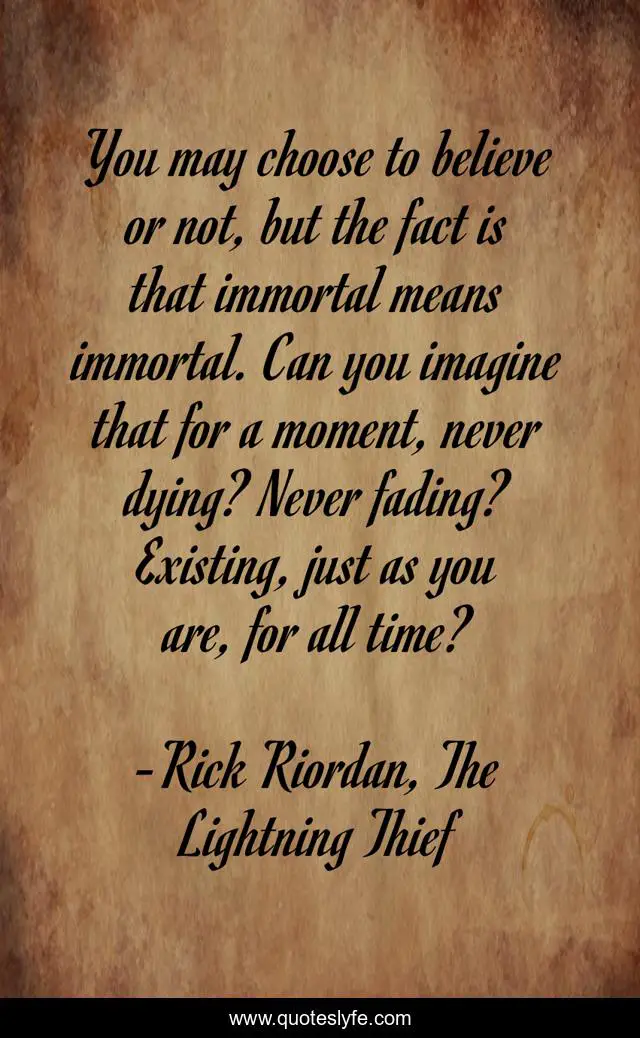 This page presents the quote "You may choose to believe or not, but the fact is that immortal means immortal. Can you imagine that for a moment, never dying? Never fading? Existing, just as you are, for all time?". Author of this quote is Rick Riordan, The Lightning Thief. .