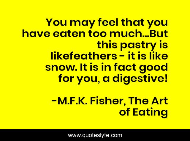 This page presents the quote "You may feel that you have eaten too much...But this pastry is likefeathers - it is like snow. It is in fact good for you, a digestive!". Author of this quote is M.F.K. Fisher, The Art of Eating. .