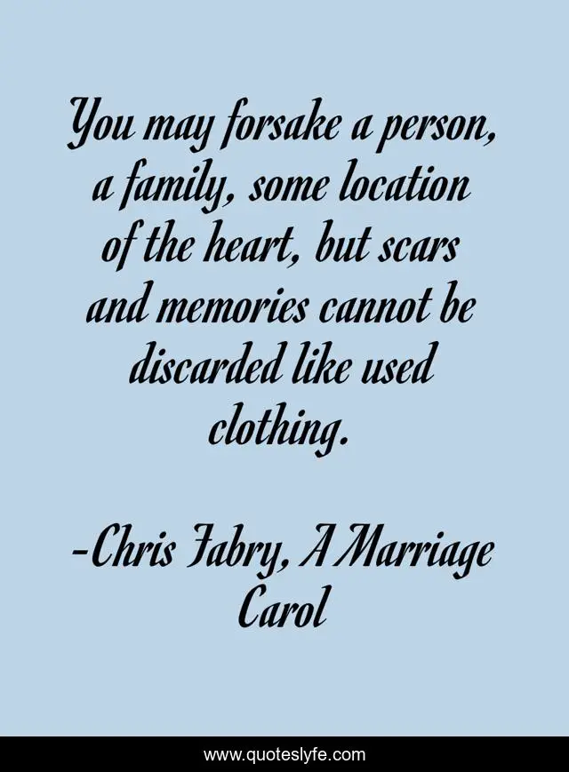 This page presents the quote "You may forsake a person, a family, some location of the heart, but scars and memories cannot be discarded like used clothing.". Author of this quote is Chris Fabry, A Marriage Carol. This quote is about life-lesson, enthusiasm, marriage-advice, inspirational,.