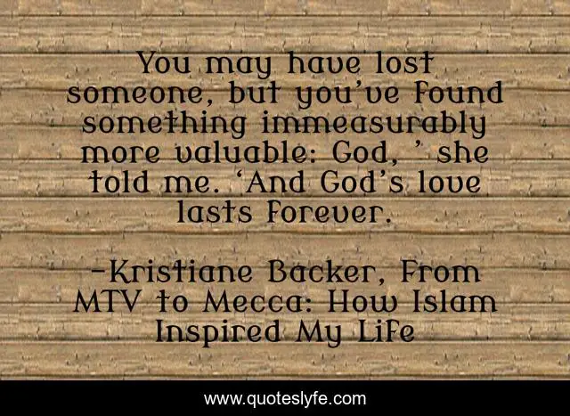 This page presents the quote "You may have lost someone, but you’ve found something immeasurably more valuable: God, ’ she told me. ‘And God’s love lasts forever.". Author of this quote is Kristiane Backer, From MTV to Mecca: How Islam Inspired My Life. This quote is about god, love, lost, affection, islam,.