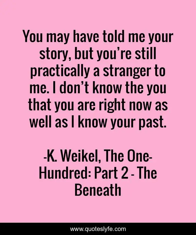This page presents the quote "You may have told me your story, but you’re still practically a stranger to me. I don’t know the you that you are right now as well as I know your past.". Author of this quote is K. Weikel, The One-Hundred: Part 2 - The Beneath. This quote is about past, weikel, stranger,.