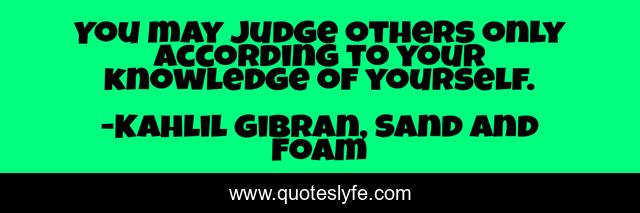 This page presents the quote "You may judge others only according to your knowledge of yourself.". Author of this quote is Kahlil Gibran, Sand and Foam. This quote is about judgemental-people, self-awareness,.