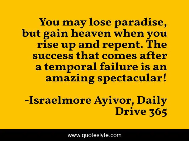 This page presents the quote "You may lose paradise, but gain heaven when you rise up and repent. The success that comes after a temporal failure is an amazing spectacular!". Author of this quote is Israelmore Ayivor, Daily Drive 365. This quote is about food-for-thought, heaven, success, failure, successful, trials, temporal, repent, astonishing,.