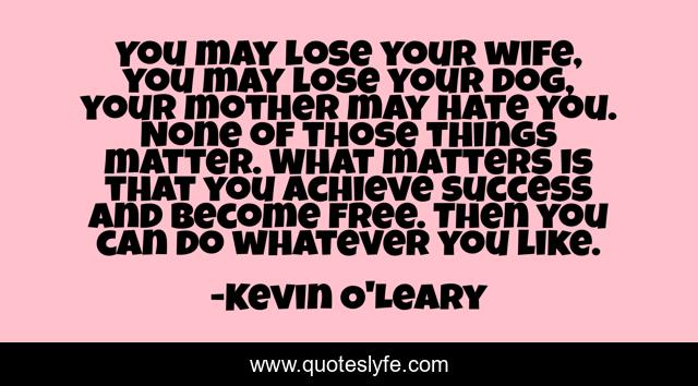 This page presents the quote "You may lose your wife, you may lose your dog, your mother may hate you. None of those things matter. What matters is that you achieve success and become free. Then you can do whatever you like.". Author of this quote is Kevin O'Leary. This quote is about hate, dog, mother,.