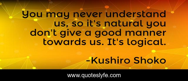 This page presents the quote "You may never understand us, so it's natural you don't give a good manner towards us. It's logical.". Author of this quote is Kushiro Shoko. This quote is about philosophy, perspective,.