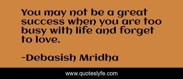 This page presents the quote "You may not be a great success when you are too busy with life and forget to love.". Author of this quote is Debasish Mridha. This quote is about life, love, knowledge, inspirational, intelligence, philosophy, wisdom, quotes, affection,.
