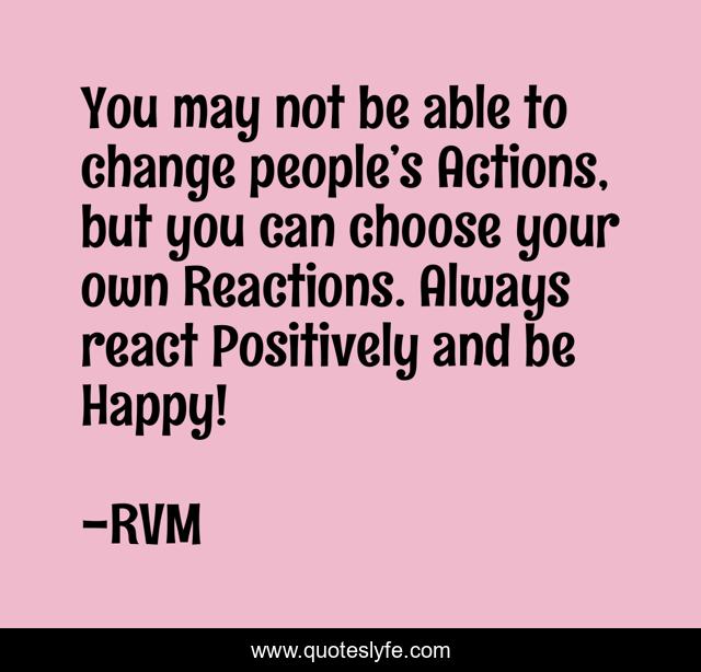 This page presents the quote "You may not be able to change people’s Actions, but you can choose your own Reactions. Always react Positively and be Happy!". Author of this quote is RVM. This quote is about motivation, inspiration,.