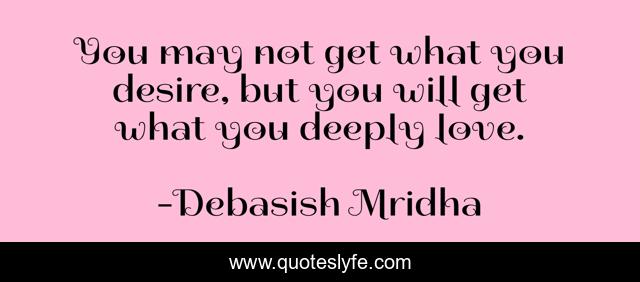 This page presents the quote "You may not get what you desire, but you will get what you deeply love.". Author of this quote is Debasish Mridha. This quote is about get-what-you-desire, inspirational, philosophy, debasish-mridha, quotes, debasish-mridha-md, get-what-you-deeply-love, enthusiasm,.