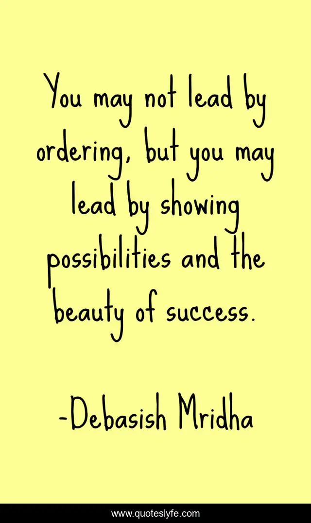 This page presents the quote "You may not lead by ordering, but you may lead by showing possibilities and the beauty of success.". Author of this quote is Debasish Mridha. This quote is about success, lead, beauty-of-success, philosophy, debasish-mridha, quotes, leadership, inspirational, enthusiasm,.