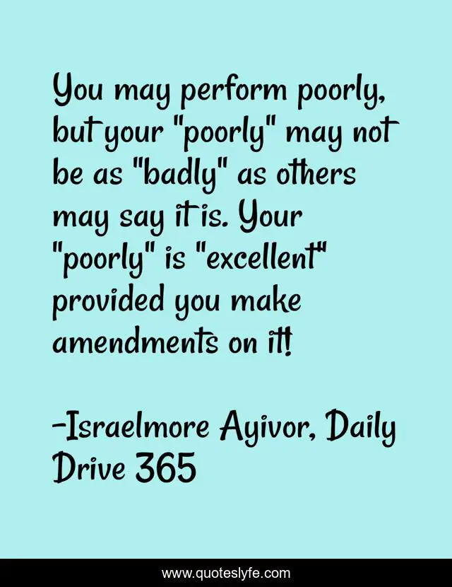 This page presents the quote "You may perform poorly, but your "poorly" may not be as "badly" as others may say it is. Your "poorly" is "excellent" provided you make amendments on it!". Author of this quote is Israelmore Ayivor, Daily Drive 365. This quote is about amendment, badly, food-for-thought, poor, amend, try-again, never-give-up, excel, perform,.