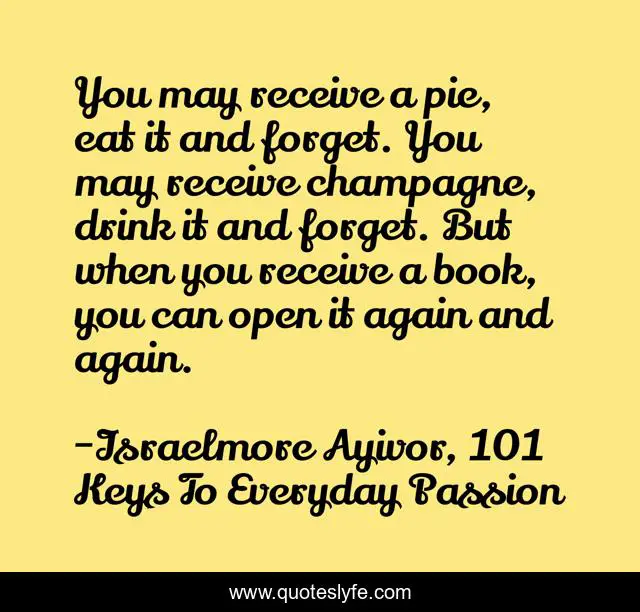 This page presents the quote "You may receive a pie, eat it and forget. You may receive champagne, drink it and forget. But when you receive a book, you can open it again and again.". Author of this quote is Israelmore Ayivor, 101 Keys To Everyday Passion. This quote is about champagne, publishing, food, pie, writing, books, authors, israelmore-ayivor, writers,.