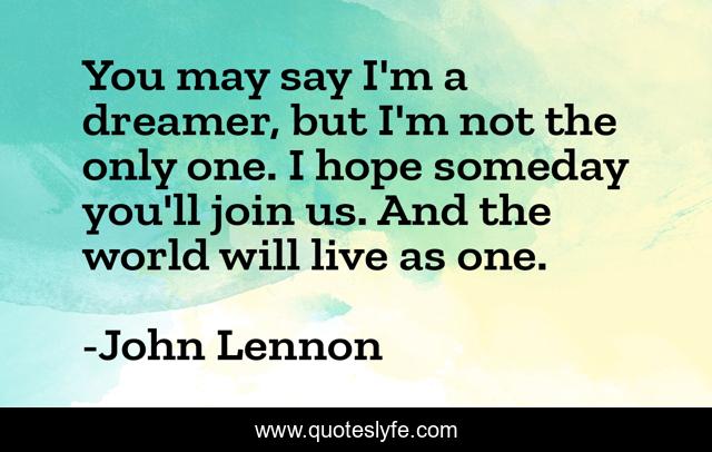 This page presents the quote "You may say I'm a dreamer, but I'm not the only one. I hope someday you'll join us. And the world will live as one.". Author of this quote is John Lennon. This quote is about beatles, peace, connection, dreamers, hope, inspirational, dreaming, enthusiasm, dreams,.