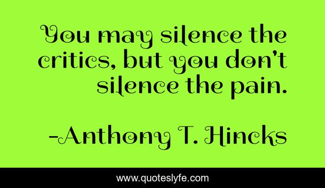 This page presents the quote "You may silence the critics, but you don't silence the pain.". Author of this quote is Anthony T. Hincks. This quote is about control, life, pain, critics, philosophy, censorship, silence,.